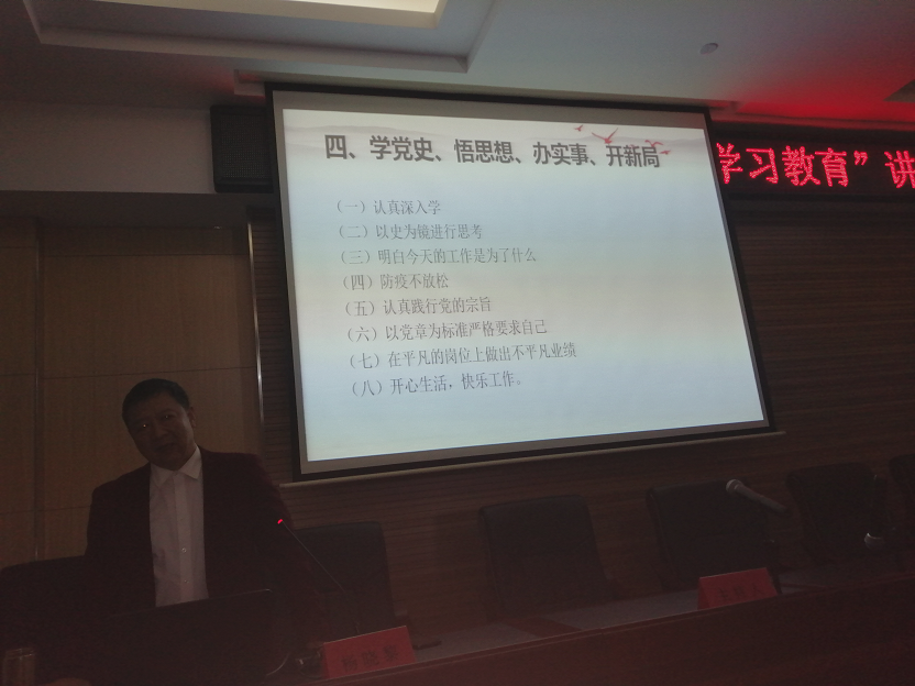 動員結(jié)束后,緊接著由市委黨校楊曉黎教授為我們作了精彩的“黨史學(xué)習(xí)教育”專題報告。楊教授為我們解讀了中國共產(chǎn)黨由誕生、發(fā)展、壯大到建立新中國,以及帶領(lǐng)全國人民建設(shè)小康社會艱難而輝煌的革命歷程。同時楊教授也結(jié)合自己對黨史的研究體會,以豐富的史實、鮮明的觀點、精辟的語言,向我們闡述了中國共產(chǎn)黨100年艱苦卓絕的風(fēng)雨歷程,總結(jié)出沒有共產(chǎn)黨就沒有新中國的偉大真理。報告深入淺出、內(nèi)容豐富,對我們加強黨的歷史和思想政治理論學(xué)習(xí),進一步提高黨性修養(yǎng),具有很強的理論指導(dǎo)作用。報告很受教育,很受啟發(fā),收獲很大。會議最后,集團總支副書記汪明星要求廣大黨員干部認真學(xué)習(xí)領(lǐng)會,掌握實質(zhì),以飽滿的工作熱情和扎實的工作作風(fēng),認真履行職責(zé),努力工作,為公司的發(fā)展壯大貢獻力量。