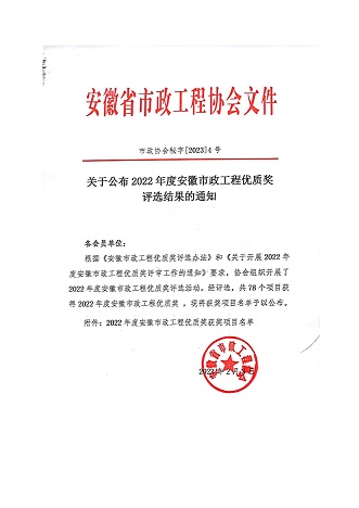 根據(jù)《安徽市政工程優(yōu)質(zhì)獎(jiǎng)評(píng)選辦法》和《關(guān)于開展2022年度安徽市政工程優(yōu)質(zhì)獎(jiǎng)評(píng)審工作的通知》要求,安徽省市政工程協(xié)會(huì)組織開展了2022年度安徽市政工程優(yōu)質(zhì)獎(jiǎng)評(píng)選活動(dòng)。黃山市建工集團(tuán)股份有限公司承建的黟縣五里轉(zhuǎn)盤至開發(fā)區(qū)段道路及雨污管網(wǎng)升級(jí)改造項(xiàng)目榮獲2022年度安徽市政工程優(yōu)質(zhì)獎(jiǎng)。